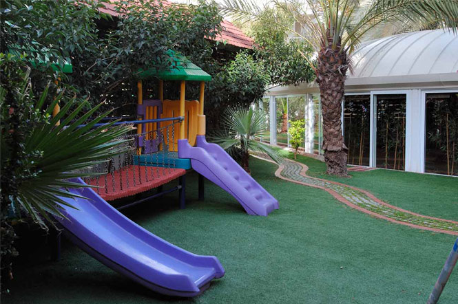 В хотела: 163 стандартни стаи (от тях 2 стаи за хора с увреждания (без балкон), макс. 3 чов., 20–24 кв.м), 11 едностайни фамилни стаи (макс. 4 чов., 32 кв.м), 7 двустайни junior suite (хол, спалня с врата, макс. 3+1 чов., 40 кв.м), 4 двустайни king suite (хол, спалня с врата, макс. 4+1 чов., 45 кв.м); Основен ресторант с открита и закрита част, 2 a-la-carte ресторанта (турски, интернационална кухня), 5 бара, 2 открити басейна, конферентна зала, здравен клуб, лекарски кабинет, фризьорски салон, Интернет кафе, Play Station зала, дневна анимация и вечерни шоу програми, билярдни маси, маси за тенис, търговски обекти: фото-студио, бижутерия, аптека, химическо чистене. Спа центърът предлага зали за масаж, сауна, турска баня, парна баня, джакузи, фитнес център. За децата: детски басейн, детска площадка, мини клуб (4-12 год.), почасово гледане на деца.