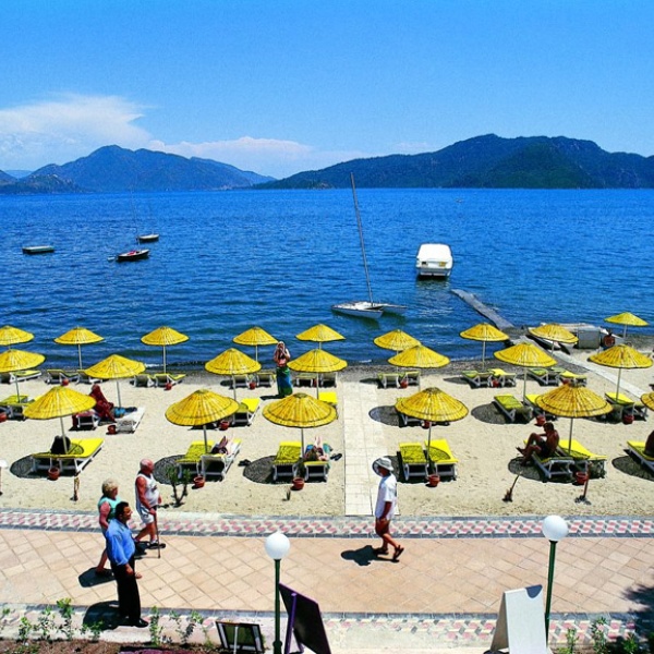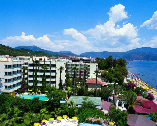 Хотел Amos е разположен на самия плаж в Сителер, Мармарис, само на 3 км от центъра на града, с голямо разнообразие от ресторанти, барове, нощни клубове и възможности за пазаруване. Най-близкото международно летище е на 90 км в град Даламан.