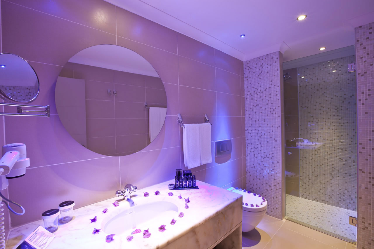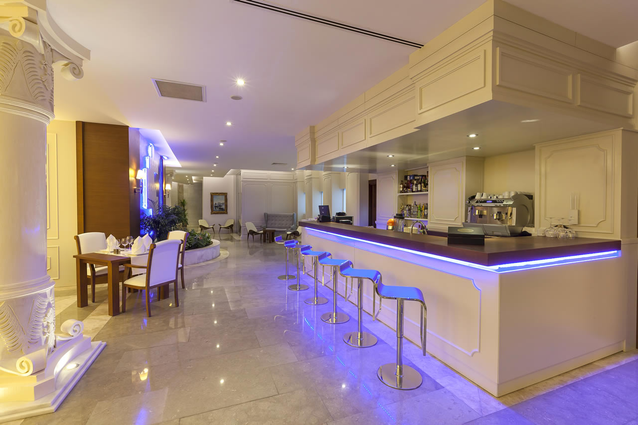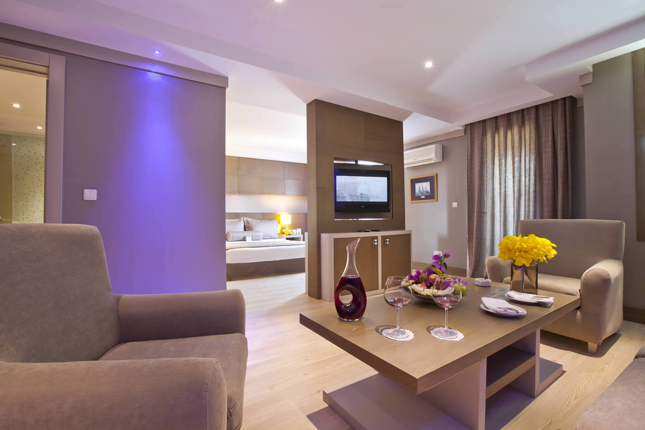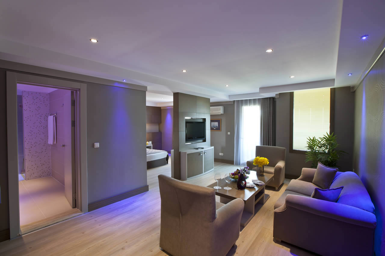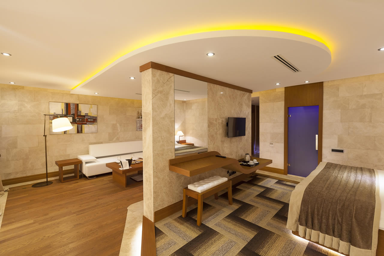 В стаята: всички стаи са комфортно обзаведени и разполагат с климатична система, LCD телевизор със сателитни канали, музика, телефон с директно международно избиране, безплатен сейф, мини бар, балкон или тераса, баня с душ, сешоар. Ежедневно почистване на стаите, смяна на спално бельо -3 пъти седмично, смяна на кърпи – всеки ден.