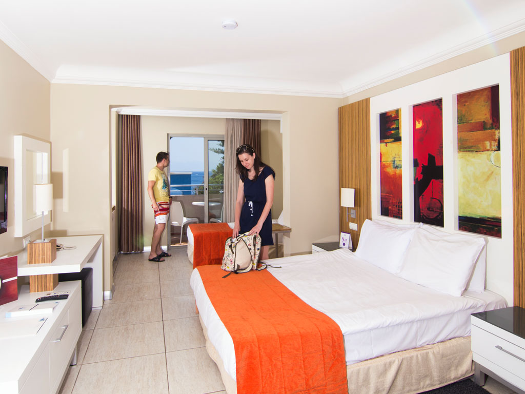 В стаята: климатик,телевизор, телефон, минибар, сейф, електрическа кана, балкон или тераса, баня с душ или вана и сешоар. Почистване на стаите – ежедневно.