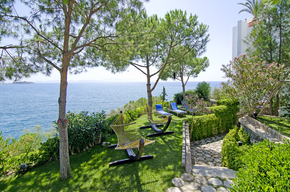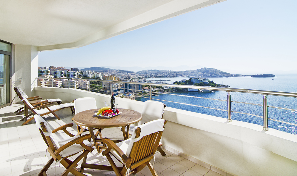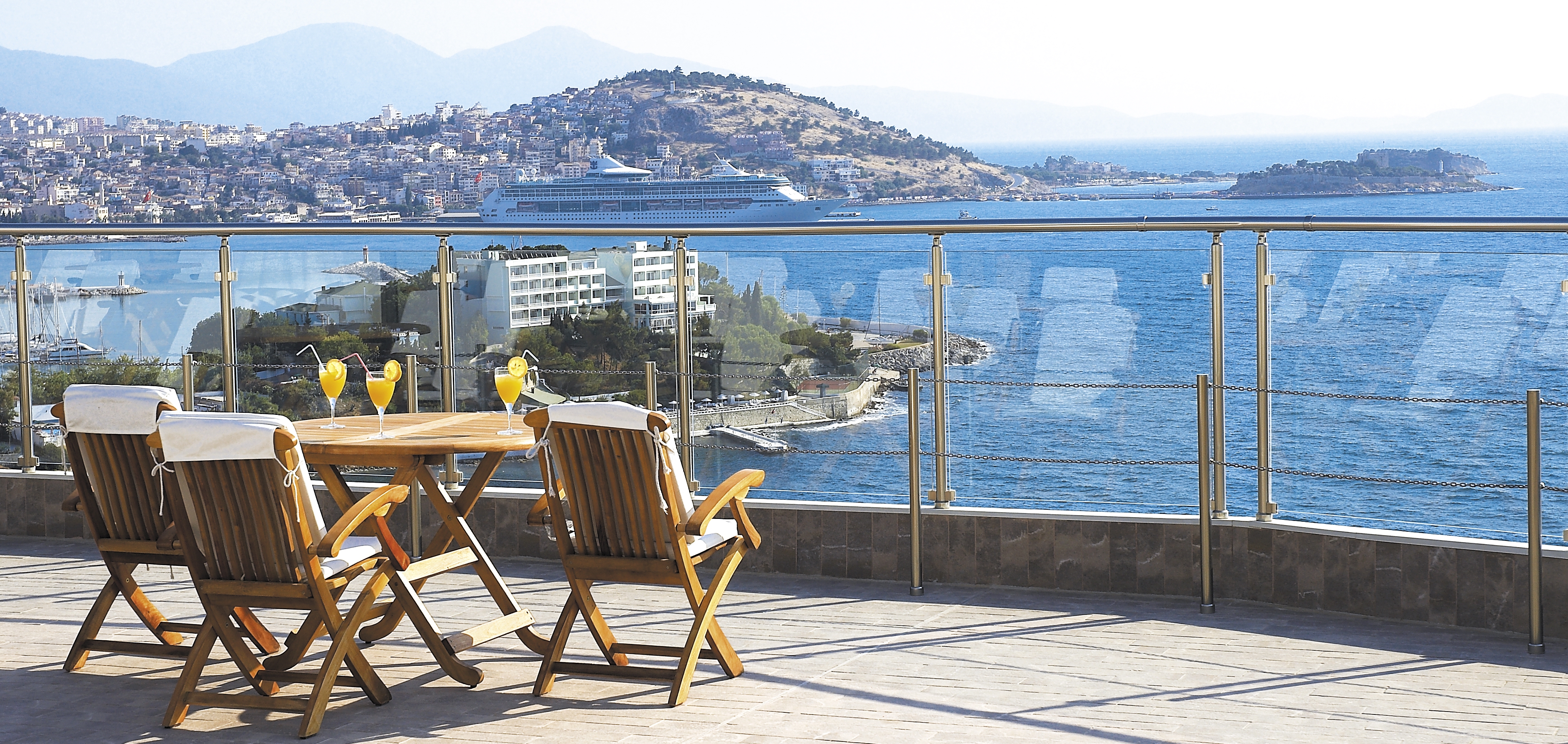 Разположен на 70 км от летището в гр. Измир, на брега на морето, върху навлизаща в Егейско море скала хотелът има прекрасна гледка към Гълъбовия остров.