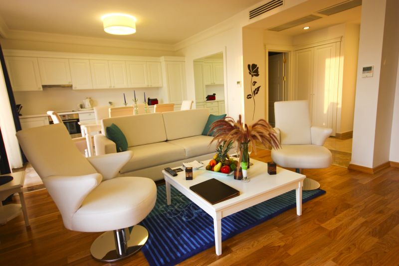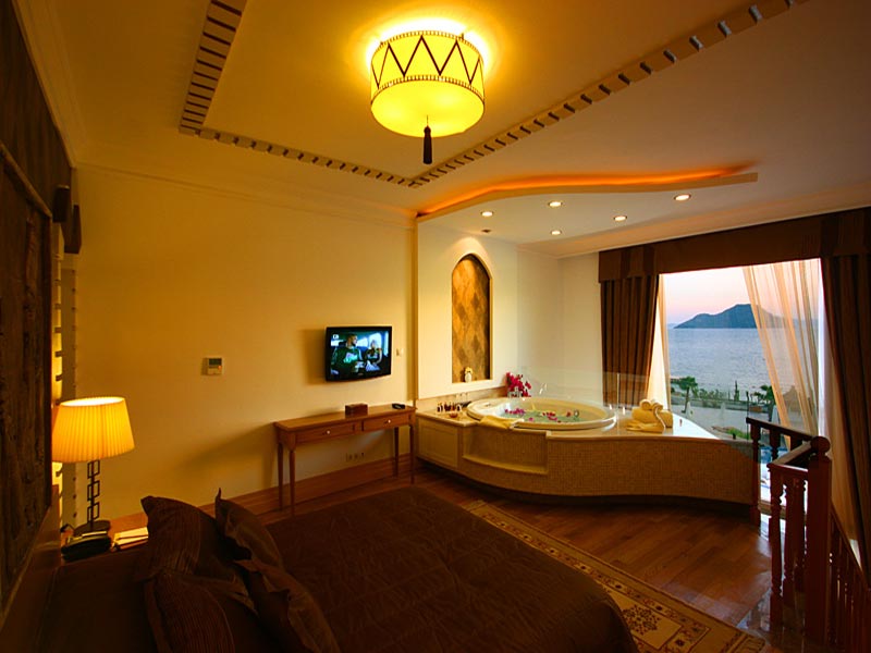 В стаята: всички стаи са оборудвани с индивидуален климатик, телевизор с плосък екран и сателитни канали, телефон, безжичен интернет, мини бар, сейф , мека мебел, гардероб, балкон или тераса, джакузи /във всички стаи/, баня с вана или душ, сешоар, безплатни тоалетни принадлежности, чехли, халат за баня. Почистване на стаята – всеки ден, смяна на спалното бельо – 3 пъти седмично. Апартаментите, с изключение на Junior Suite /най-малкия апартамент 50 - 70 m²/, разполагат и с кухненски бокс, хладилник, кът за хранене, електрическа кана.